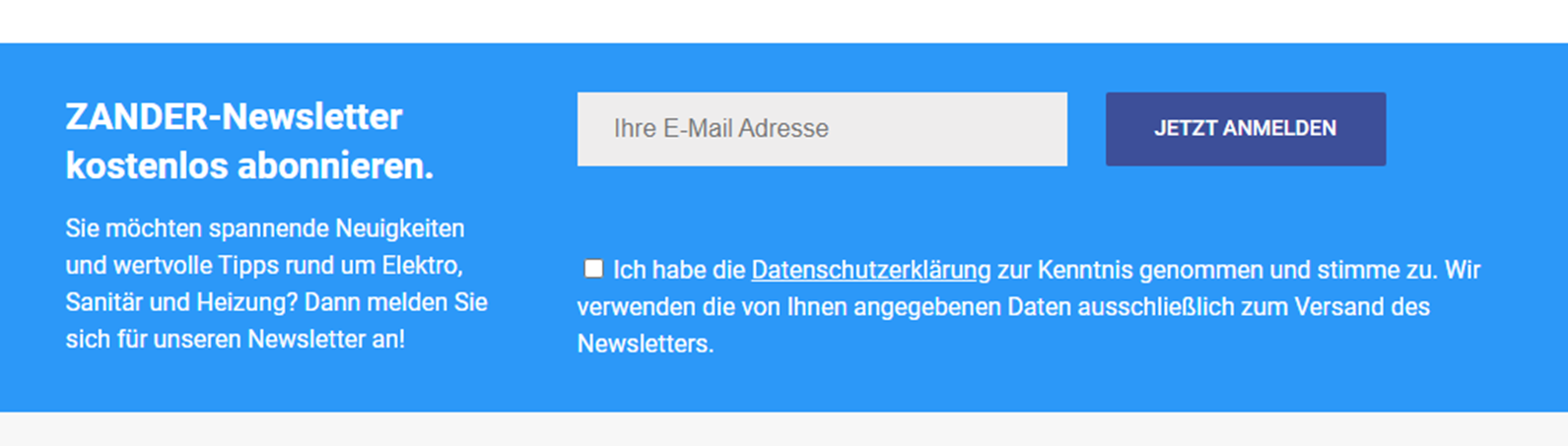 Um sich für den Newsletter anzumelden, gehen Sie in ZANDERonline (https://zander.online/home) ganz nach unten bis Sie folgenden Banner sehen: