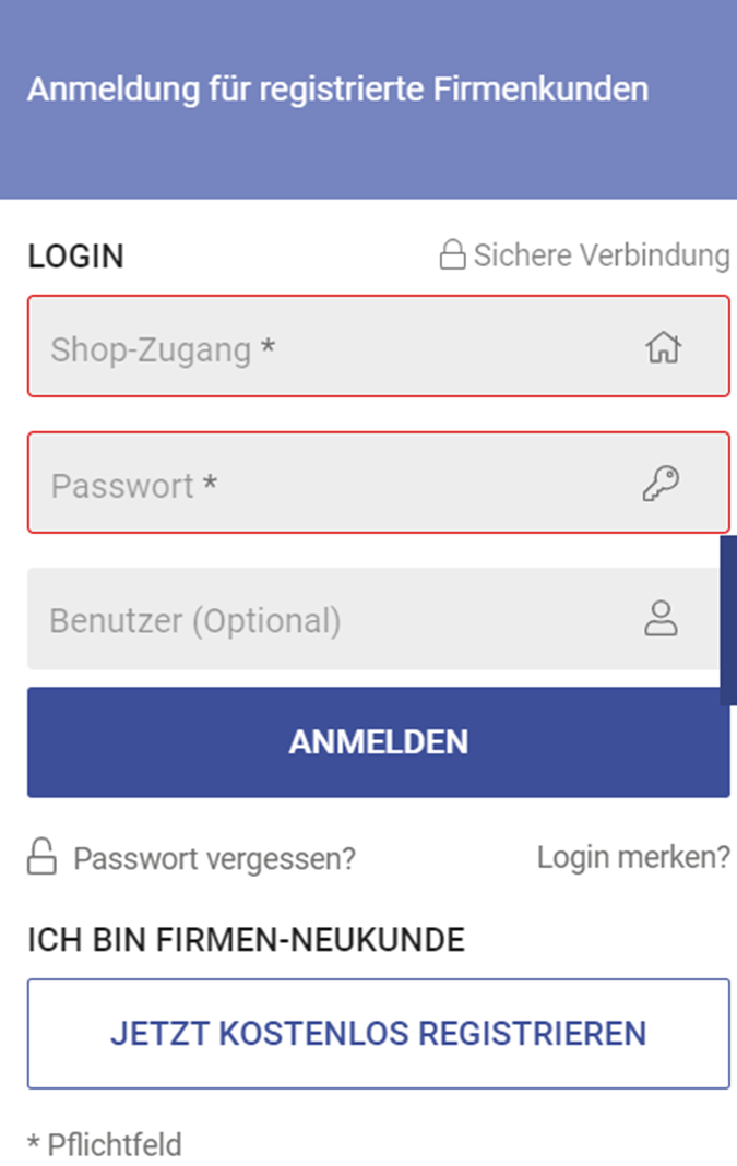 Als Unterbenutzer müssen Sie Ihren Shop-Zugang, Ihren Benutzernamen aus der Benutzerverwaltung und Ihr vom Administrator zugewiesenes Passwort eingeben.