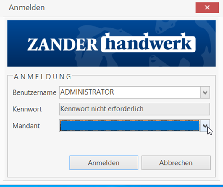 Haben Sie ZANDERhandwerk neu installiert (FAQ-Beitrag: Wie installiere ich ZANDERhandwerk?) und das Feld "Mandant" ist leer (s. Bild), dann folgen Sie den folgenden Schritten um das Problem zu lösen.