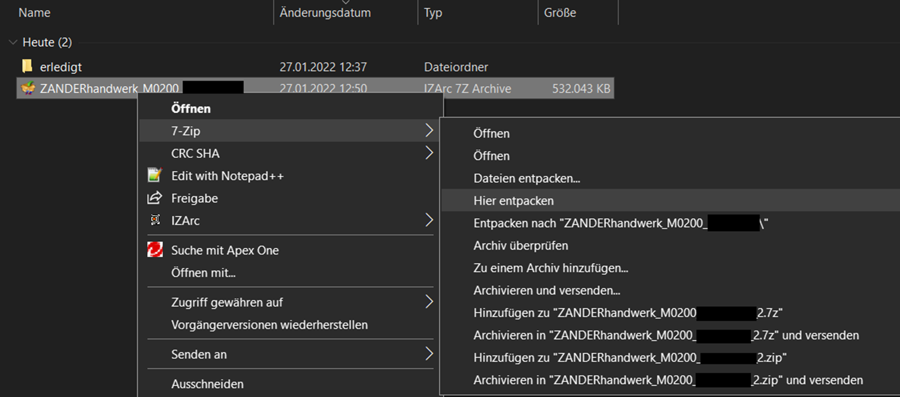 Klicken Sie mit der rechten Maustaste auf die .zip-Datei und wählen Sie entpacken aus. Sollte diese Option nicht verfügbar sein, benötigen Sie ein extra Programm zum entpacken von .zip Dateien. Dafür kann beispielsweise das Programm "7-Zip" verwendet werden.