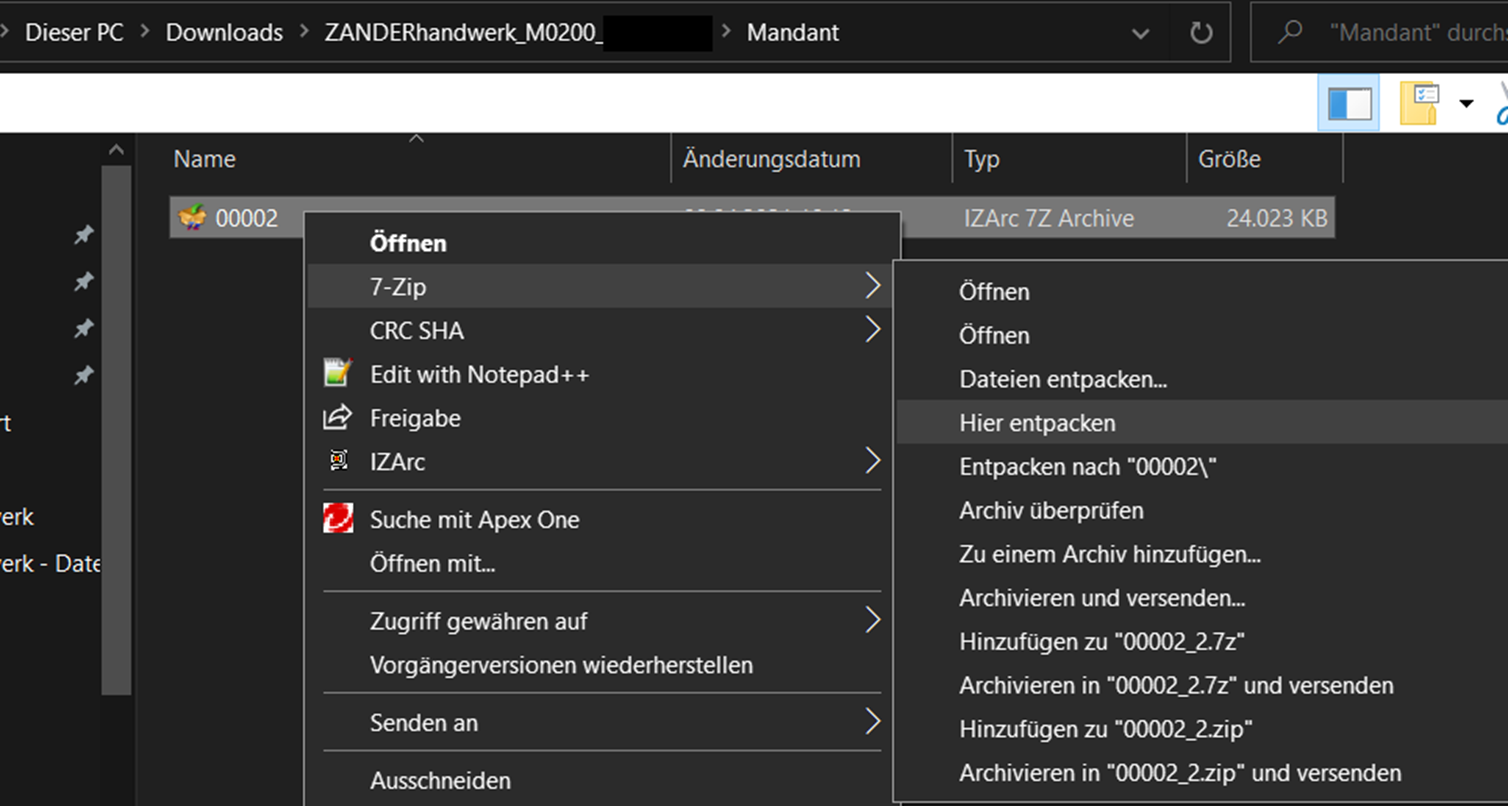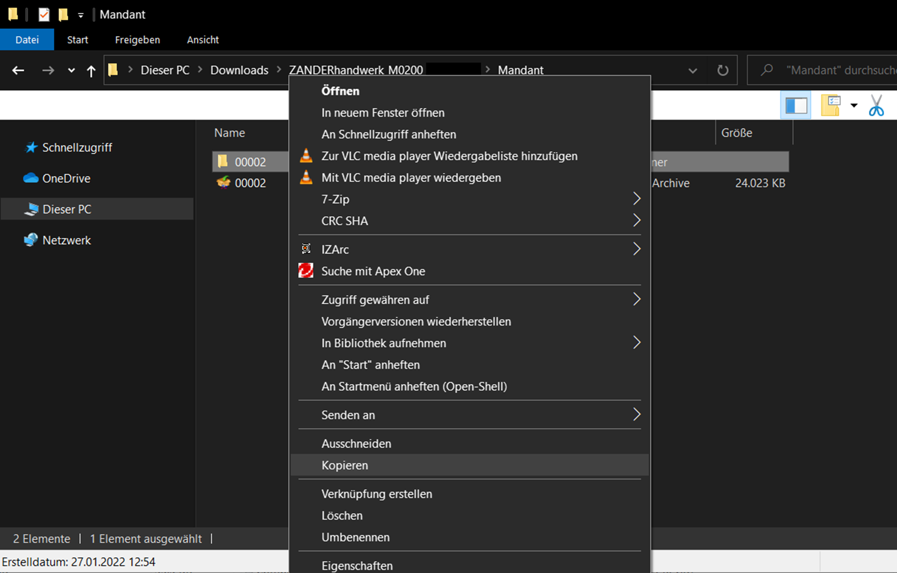 Im nächsten Schritt müssen Sie den Mandanten entpacken, da dieser auch wieder als .zip-Datei integriert ist. Öffnen Sie dafür den Ordner, aus der zuvor entpackten .zip-Datei. In diesem Ordner gibt es den Ordner "Mandant". Öffnen Sie diesen und dort ist die .zip-Datei "00002". Entpacken Sie auch diese Datei wieder.