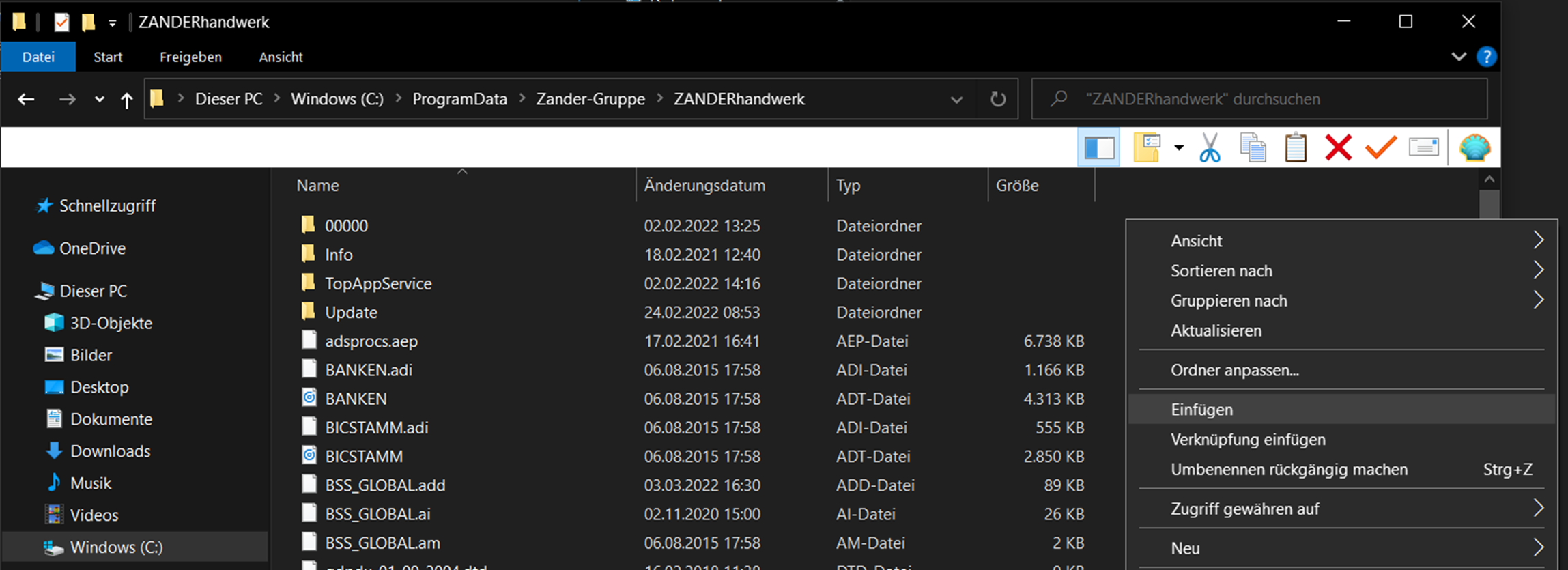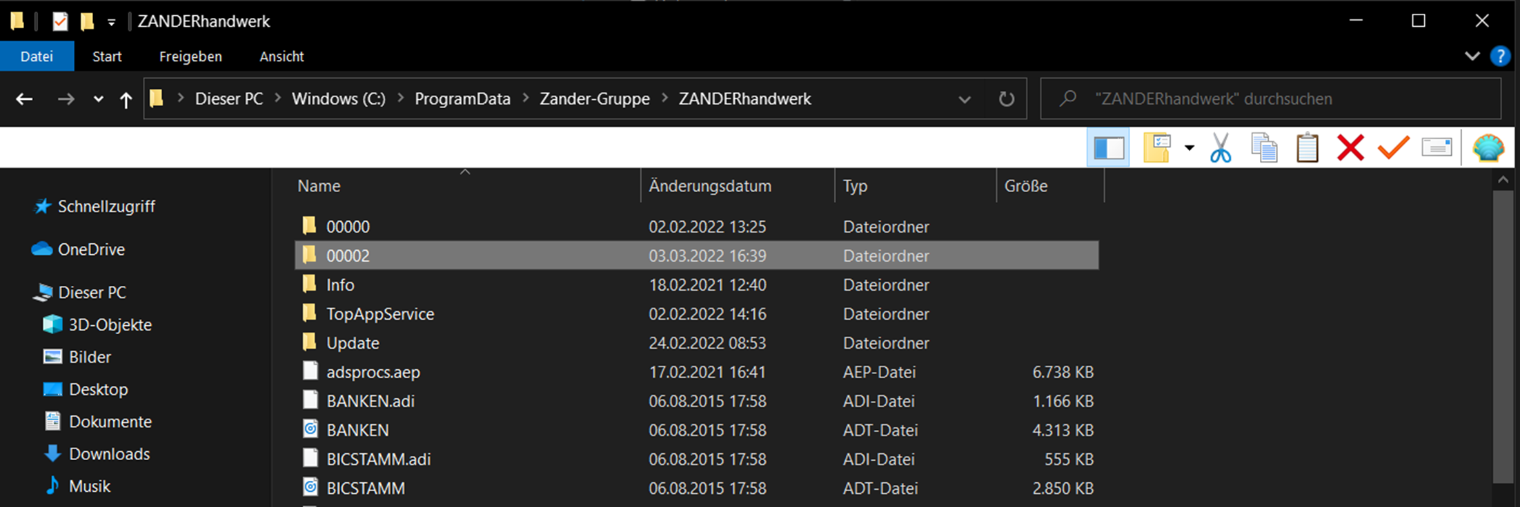 Gehen Sie nun zu Ihrem Datenpfad (C:\ProgramData\Zander-Gruppe\ZANDERhandwerk). Öffnen Sie den Ordner "ZANDERhandwerk" und Ihr Ordner sollte wie im nächsten Bild aussehen.