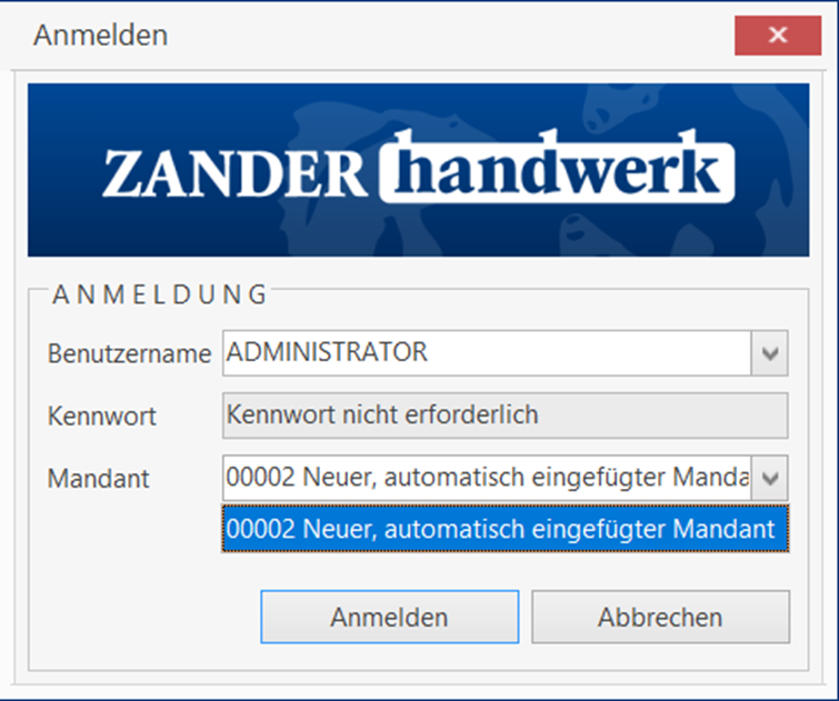 Den Ordner können Sie jetzt schließen. Starten Sie als nächstes ZANDERhandwerk. Der Mandant sollte nun automatisch gezogen werden. Ist das Feld immer noch leer, dann klicken Sie auf den Pfeil auf der rechten Seite des Felds "Mandant" und wählen Sie den Mandant "00002" manuell aus. Klicken Sie auf "Anmelden" um mit ZANDERhandwerk zu starten.