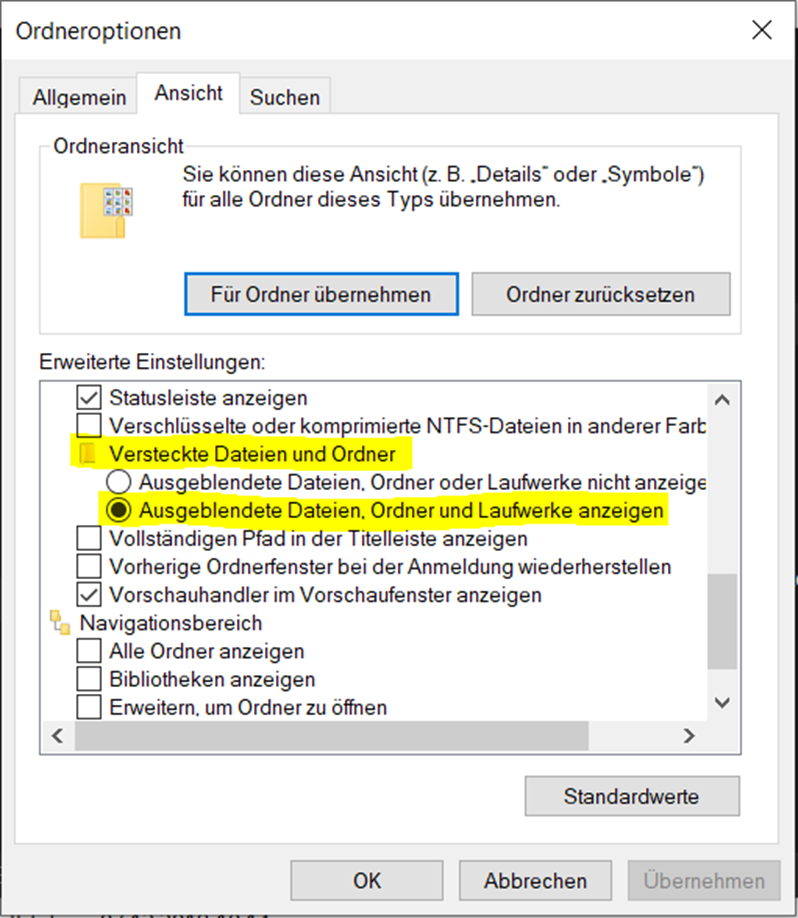 Es sollte sich nun ein neues Fenster öffnen. Wählen Sie in diesem den Reiter "Ansicht" aus. Scrollen Sie hier bis fast ganz unten, bis Sie zu dem Punkt "Versteckte Dateien und Ordner" gelangen. Setzen Sie den Punkt bei "Ausgeblendete Dateien, Ordner und Laufwerke anzeigen" und speichern Sie die Änderung mit "Übernehmen" und schließen Sie anschließend das Fenster mit "OK"
