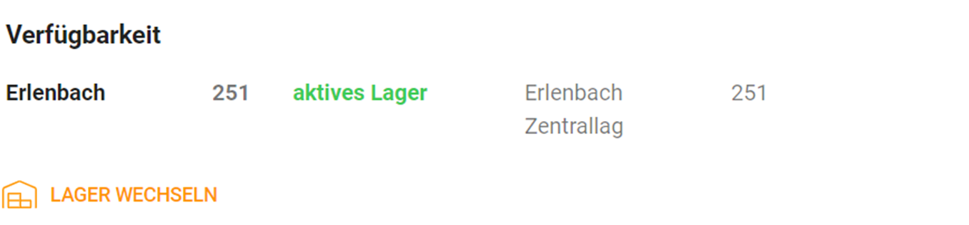 Die Verfügbarkeitsanzeige eines Artikels befindet sich in in der Suche neben dem Artikel. Wenn Ihr Zugang dazu berechtigt ist, können Sie die Verfügbarkeit des ausgewählten Artikels in den verschiedenen Lägern in der Artikeldetailansicht einsehen und das Lager gegeben falls wechseln.