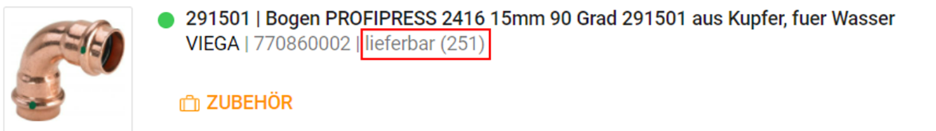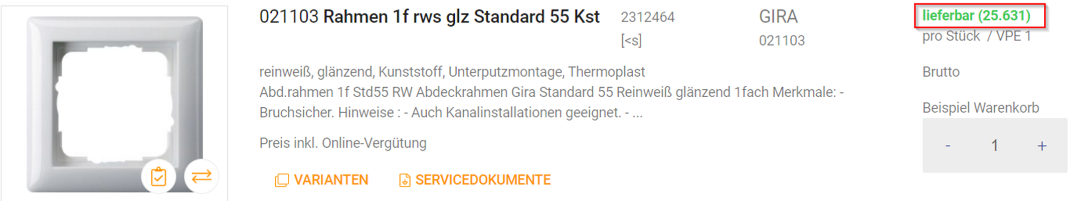 Die Verfügbarkeitsanzeige gibt über die Lieferfähigkeit des vor eingestellten Lagers Auskunft.