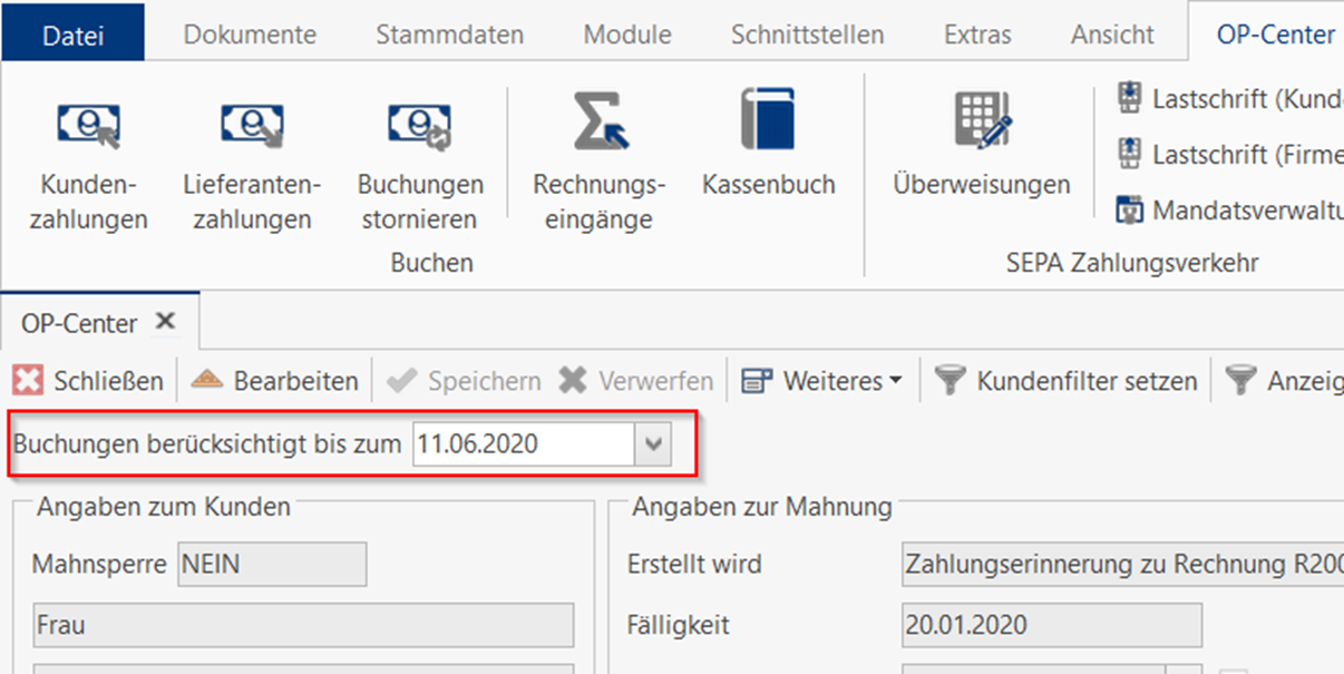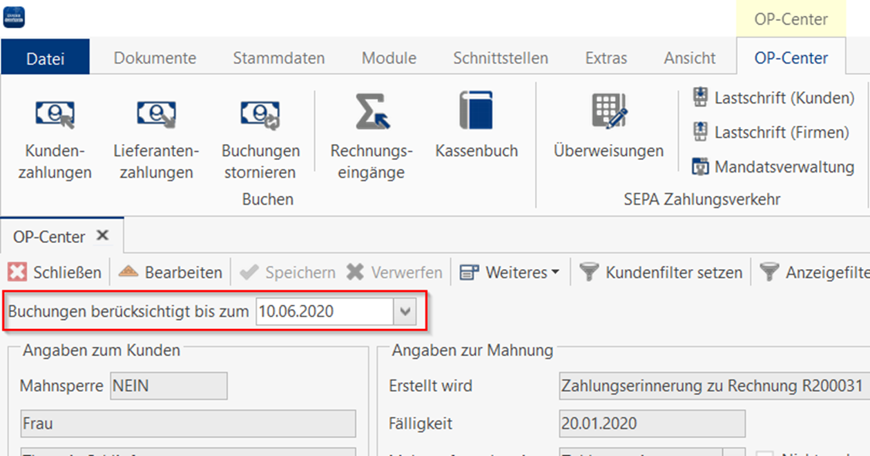 Damit Sie die Zahlungserinnerung auch im Mahnwesen angezeigt bekommen, muss das Datum verändert werden. z.B. auf einen Tag vor (vom 10.06. auf den 11.06.).