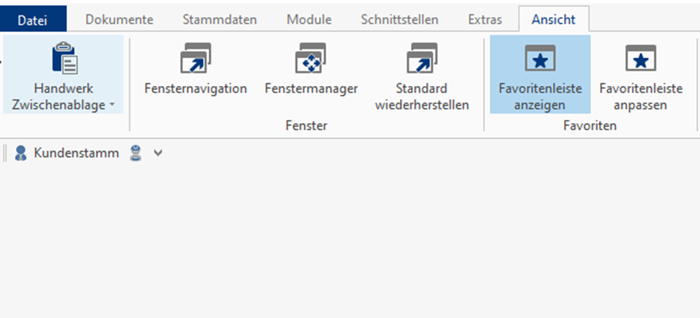 Unter dem Reiter "Ansicht" können Sie mit dem Punkt "Favoritenleiste anpassen" die Inhalte Ihrer Favoritenleiste bestimmen. Nach dem Klick auf "Favoritenleiste anpassen" öffnet sich ein neues Fenster, in welchem Sie die verschiedenen Funktionen für die Favoritenleiste aktivieren können. Setzen Sie einen Haken neben der jeweiligen Funktion um diese zur Favoritenleiste hinzuzufügen. In der rechten Seite des Fensters erhalten Sie einige Einstellungen um Ihre Favoriten anzupassen. Im Feld "Anzeigen als" können Sie den Namen der Funktion in der Favoritenleiste ändern. Über das Feld "Anzeigeformat" können Sie einstellen, wie die Funktion im Favorit angezeigt werden soll. Bestätigen Sie Ihre Einstellungen über den Button "Schließen".