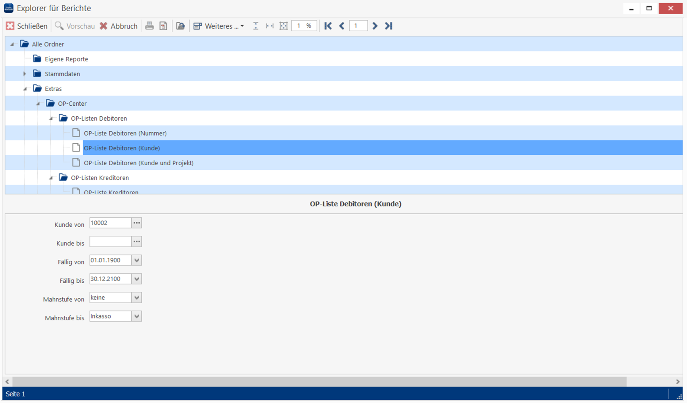Im nachfolgenden Fenster können verschiedene Auswertungen zu Themen wie Buchhaltung/OP Center, Dokumentenhistorie, Umsatz etc. durchgeführt werden. Dafür einfach die gewünschte Auswertung auswählen, die benötigten Felder für die Auswertung befüllen und auf „Vorschau“ klicken. Anschließend kann die Auswertung ausgedruckt oder als PDF gespeichert werden.