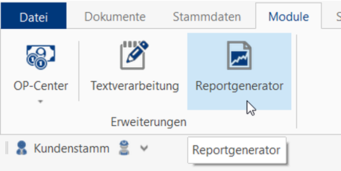 Zum Einen steht der "Reportgenerator" unter dem Menüpunkt "Module" zur Verfügung.