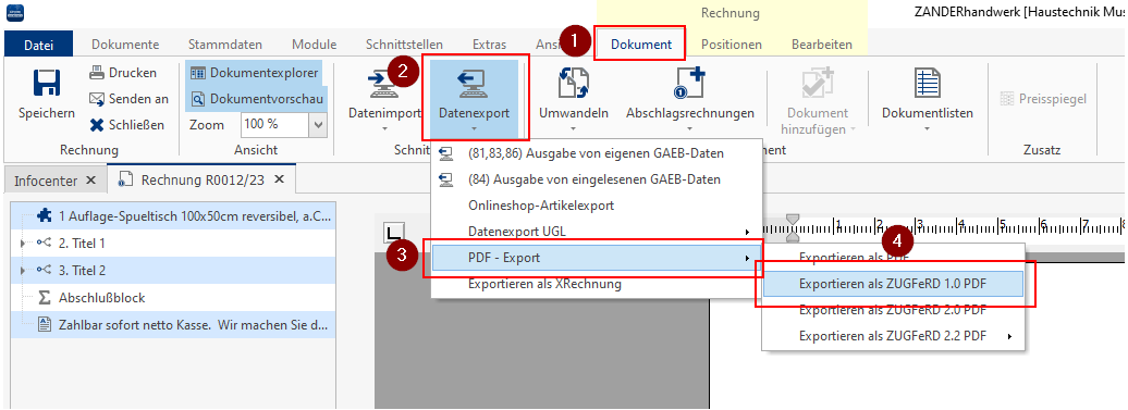Öffnen Sie die gewünschte Rechnung und klicken Sie auf den gelb markierten Reiter "Dokument" und wählen Sie unter "Datenexport" den Punkt "PDF - Export" aus. Hier stehen Ihnen mehrere ZUGFeRD Versionen für den Export bereit. Wählen Sie das gewünschte ZUGFeRD-Format aus, damit Sie die Rechnung speichern können.