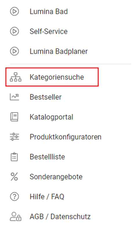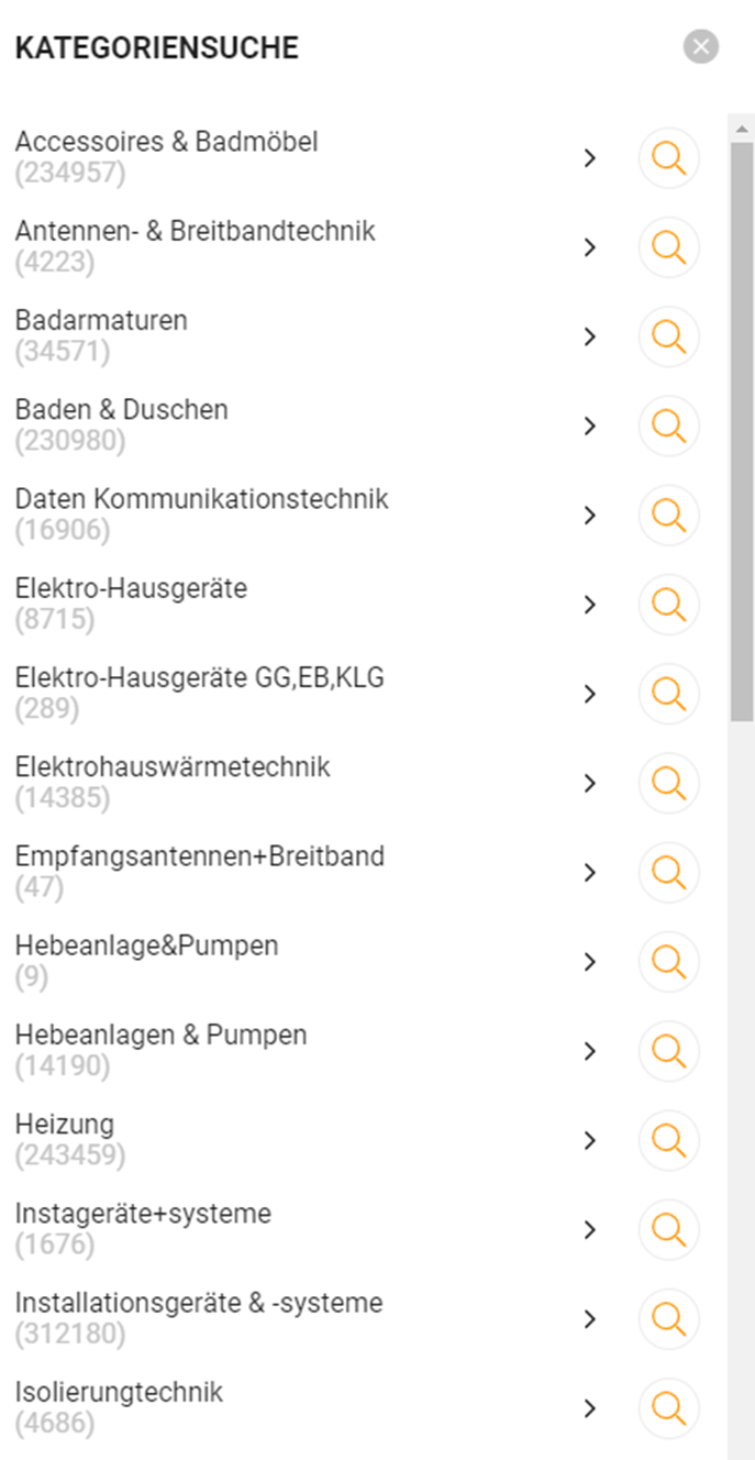 Wir haben verschieden Oberbegriffe genutzt wie z. B. „Accessoires & Badmöbel“. Sie könnten die suche jetzt schon, starten indem Sie auf die LUPE rechts klicken. Möchten Sie eine genauere Filterung durführen, klicken Sie auf „Accessoires & Badmöbel“, unter diesem Oberbegriff sehen Sie beispielsweise die Unterteilung in Accessoires, Badmöbel und Leuchten. Wie schon beschrieben können Sie nun auf die LUPE klicken, um die Suche zu starten. Durch Auswahl einer Bezeichnung, ist eine tiefere Selektion möglich.