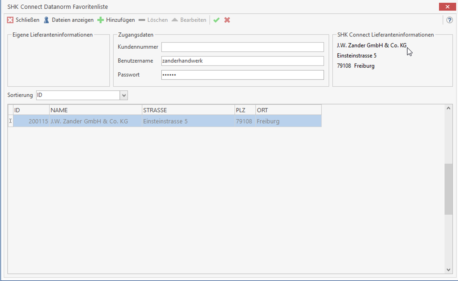 Um die SHK Connect Schnittstelle in ZANDERhandwerk einzurichten, ist es notwendig, dass es einen bestehenden Lieferanten im System gibt. (Stammdaten > Lieferanten).
