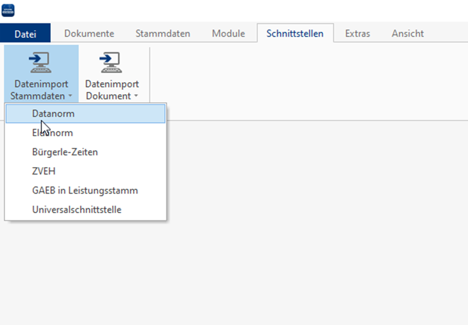 Gehen Sie dafür auf den Reiter "Schnittstellen" und klicken Sie auf "Datenimport Stammdaten". Wählen Sie im nachfolgenden Dropdownmenü "Datanorm" aus. Jetzt sollte sich ein neues Fenster öffnen.