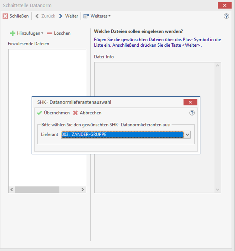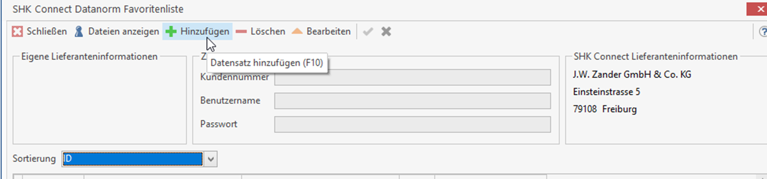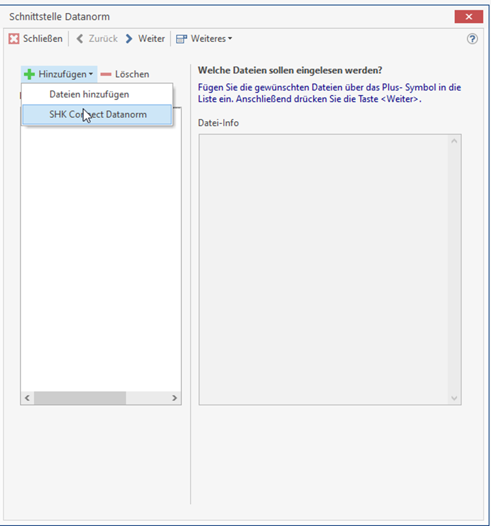 Klicken Sie in diesem Fenster auf "+Hinzufügen" und wählen Sie "SHK Connect Datanorm" aus.
