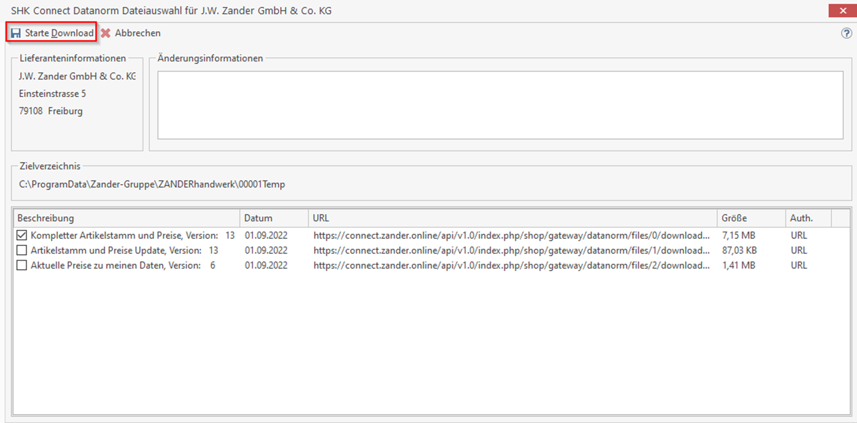 Sobald Sie die Daten gespeichert haben, können Sie über den Button "Dateien anzeigen" die aktuell bereitstehenden Datanorm Daten abrufen. Die Zugangsdaten sind für zukünftige Datanormimporte per SHK Connect gespeichert und Sie müssen die Datanorm Daten nur über "Dateien anzeigen" aufrufen.