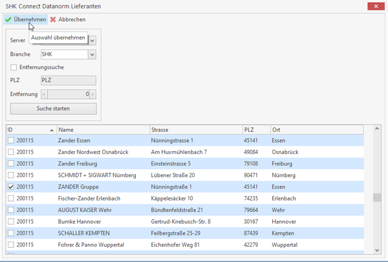 Legen Sie als nächstes die Suchkriterien fest. Die Eingaben in den Feldern "Server" und "Branche" variiert von Lieferant zu Lieferant. Meist finden Sie den Lieferant jedoch mit den folgenden Eingaben: Server = SHK-Connect / Branche = SHK. Starten Sie die Suche über den Button "Suche starten". Haben Sie Ihren Lieferant gefunden, wählen Sie diesen aus indem Sie einen Haken im Feld "ID" setzen. Bestätigen Sie den Lieferant über den Button "Übernehmen".