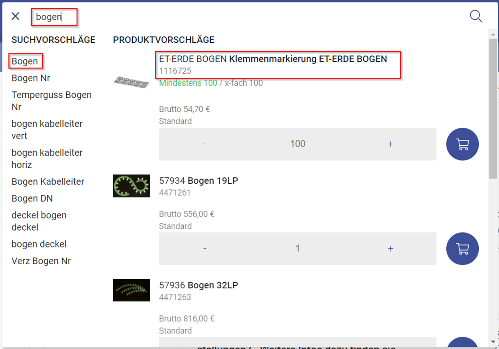 Im Suchschlitz können Sie unsere Artikelnummer, den Namen eines Produktes, EAN-Nummer, Lieferantennummer oder auch Artikelbezeichnungen eingeben. Während Sie Ihren Suchbegriff eingeben, werden Ihnen Such- und Produktvorschläge unter dem Suchschlitz angezeigt. Hier können Sie auf einen Produkt- oder Suchvorschlag klicken, um zu diesen Artikel zu gelangen oder Sie bestätigen Ihre Suche im Suchschlitz einfach mit der Eingabetaste.