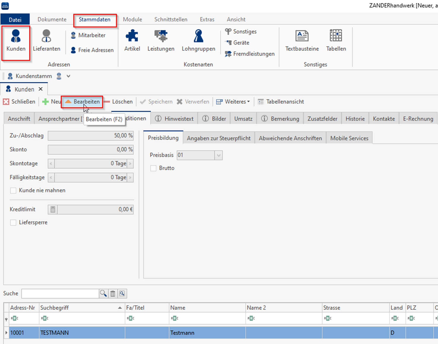 Klicken Sie im Reiter "Stammdaten" auf den Punkt "Kunden" und wählen Sie einen Kunden aus. Wählen Sie anschließend im Kunden den Reiter "Konditionen" aus. Hier können Sie per Klick auf "Bearbeiten" die Konditionen des einzelnen Kunden individuell anpassen.