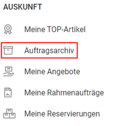 Um eine 1-Klick Bestellung zu stornieren klicken Sie oben rechts auf Ihren Firmennamen, um das Menü "Mein Konto" zu öffnen. Hier klicken Sie unter dem Punkt "Ihr Konto" auf "Auftragsarchiv".