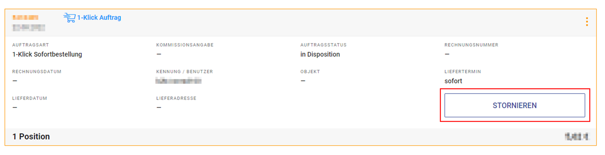Ihr 1-Klick Auftrag wird Ihnen nun ganz oben angezeigt. Wenn Sie die den Auftrag noch stornieren können, wird Ihnen hier der Button "Stornieren" angezeigt. Jetzt müssen Sie nur noch auf den Button "Stornieren" klicken, danach öffnet sich noch eine Maske auf der Sie erneut auf "Stornieren" klicken müssen.