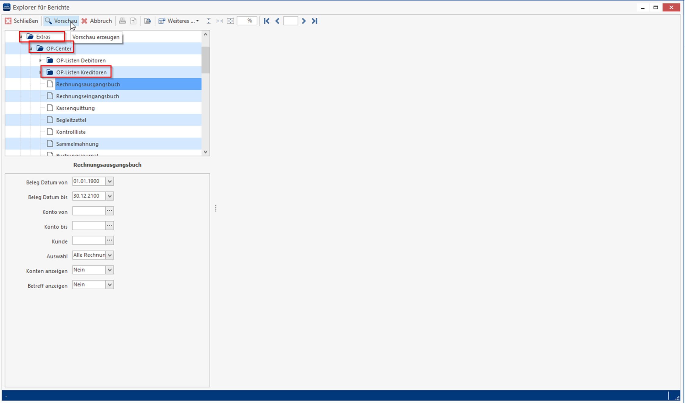 Sie können Ihr Rechnungsausgangsbuch ganz einfach unter Module > Reportgenerator > Extras > OP-Center > Rechnungsausgangsbuch (Nachweis) > Vorschau über das Drucksymbol in der Leiste ausdrucken.