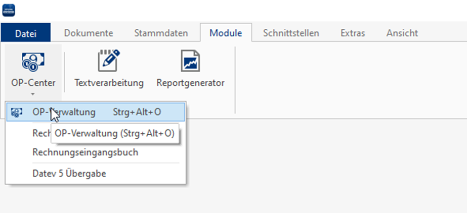 Eine Übersicht über die offenen Posten finden Sie im OP-Center unter Module > OP-Center > OP-Verwaltung.