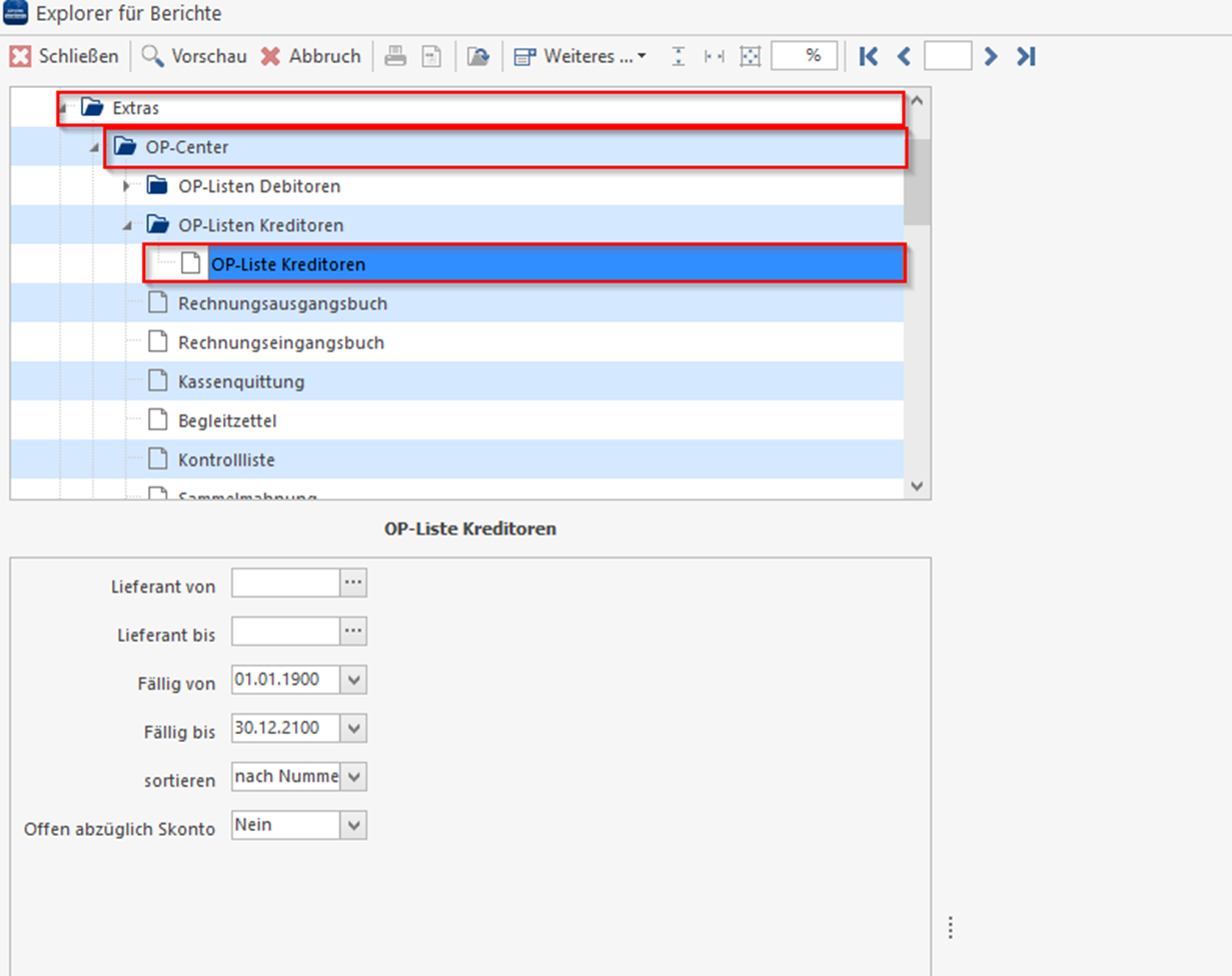 Im Programm unter Module > Reportgenerator > Extras > OP-Center > OP-Listen Kreditoren > Offene-Posten-Liste Debitoren und Kreditoren.