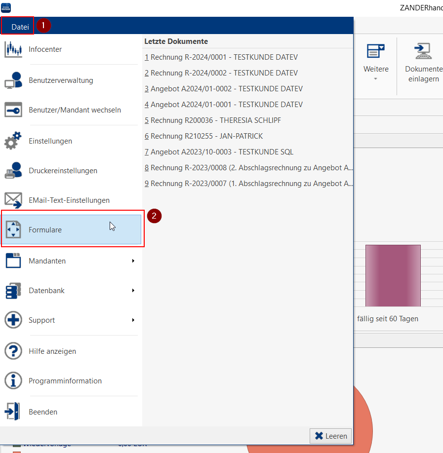 Um den Bearbeitungsbereich eines Formulars zu verändern, muss der Formulareditor geöffnet werden. Klicken Sie dafür in ZANDERhandwerk auf "Datei" (1) (oben links) und wählen Sie die Option "Formulare" (2) aus. Ein neues Fenster mit einem leeren Formular öffnet sich.