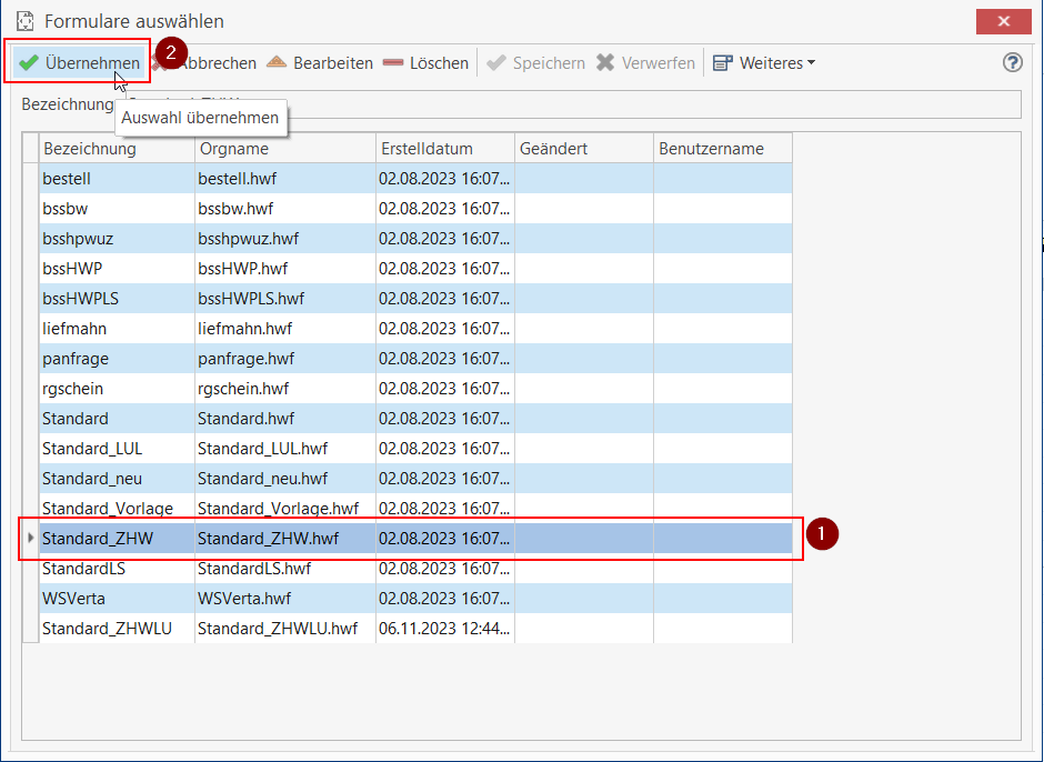 Wählen Sie im nachfolgende Fenster das Formular aus, welches Sie bearbeiten möchten. In unserem Beispiel ist es das Formular "Standard_ZHW". Bestätigen Sie Ihre Eingabe mit "Übernehmen" (2).