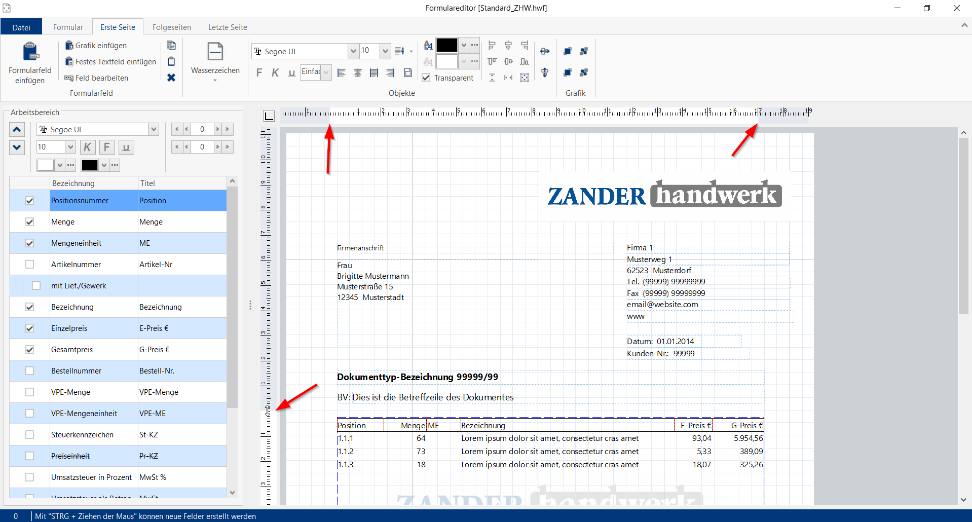 Der Arbeitsbereich kann über das Lineal links bzw. über dem Formular angepasst werden. Um den Arbeitsbereich anzupassen, navigieren Sie Ihre Maus an die Stelle des Lineals, an der das Lineal von grau zu weiß wechselt (s. Markierungen im folgenden Screenshot). Klicken und halten Sie die linke Maustaste gedrückt und ziehen Sie den Bereich am Lineal größer, bis es Ihren Wünschen entspricht.