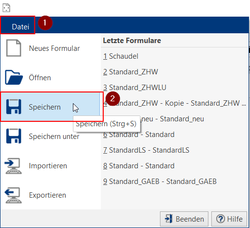 Haben Sie alle gewünschten Änderungen vorgenommen, speichern Sie das Formular noch ab. Klicken Sie dafür erneut auf "Datei" (1) (oben links) und wählen Sie im Anschluss "Speichern" (2) aus. Jetzt können Sie den Formulareditor beenden und neue Dokumente mit Ihrem angepassten Formular öffnen.