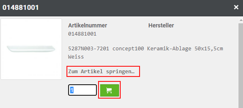 Hier öffnet sich ein kleines Fenster, in dem Ihnen weitere Informationen zu dem Artikel angezeigt werden. Hier haben Sie die Möglichkeit "zum Artikel zu springen" (im Onlineshop) oder den Artikel in den Warenkorb zu legen.