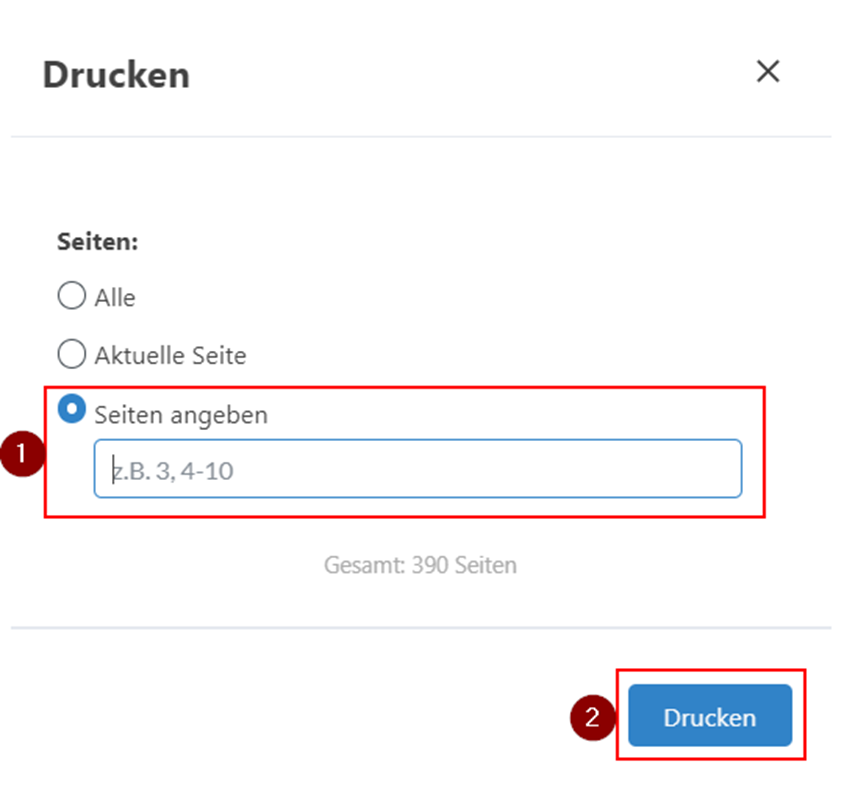 Klicken Sie dazu auf das Drucker-Symbol und geben Sie die ausgewählten Seiten per Zahl in die Auswahl ein. Beim Drucken der Seiten wählen Sie als PDF speichern aus.