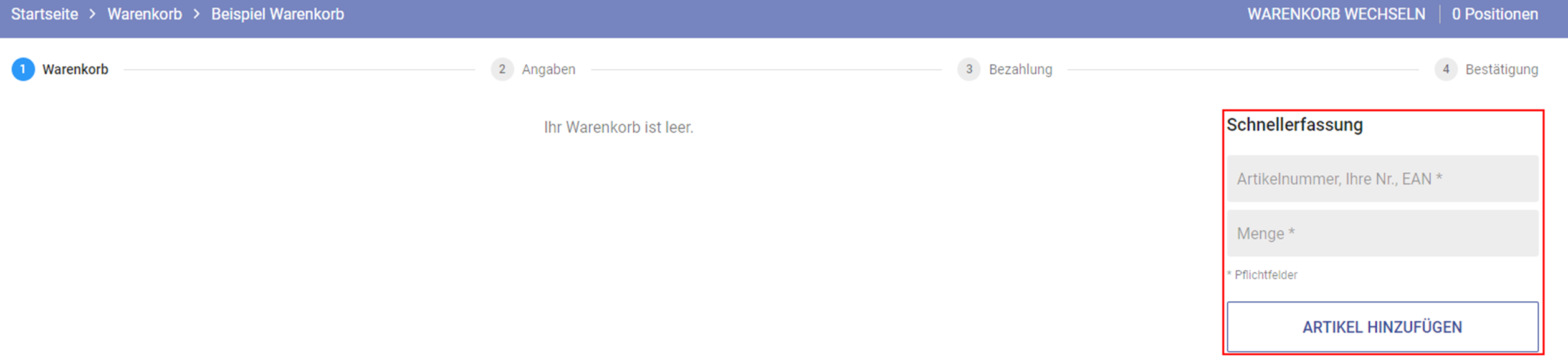 Die Schnellerfassung finden Sie in ZANDERonline direkt im Warenkorb.