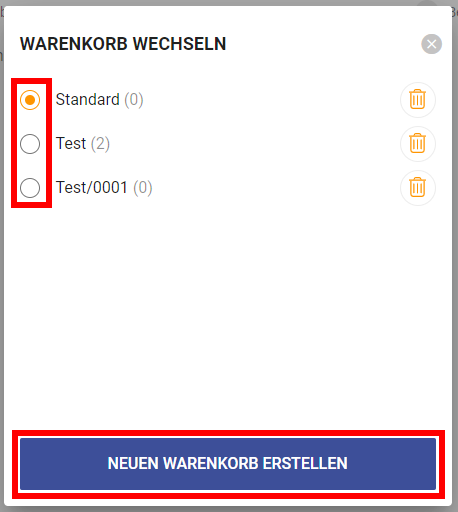 3. Nun öffnet sich ein Fenster in dem Sie den Warenkorb wechseln oder einen neuen erstellen können