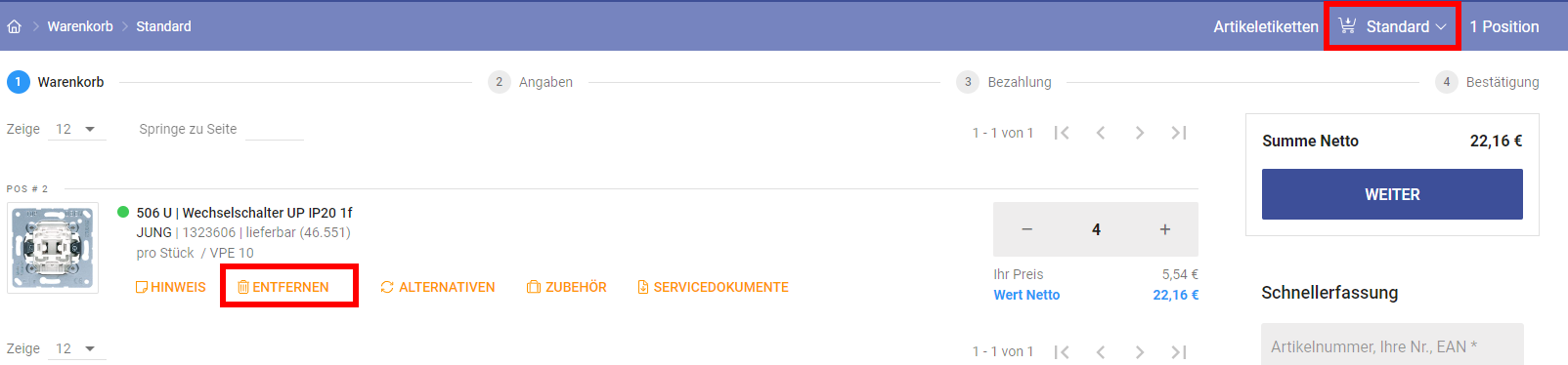 2. Wählen Sie den gewünschten Warenkorb aus und nutzen Sie zum Löschen des Artikels den "Entfernen"-Button.