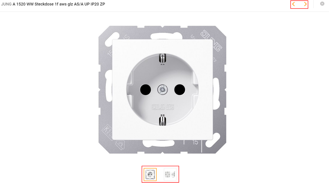 - Wenn Sie auf das „große“ Bild klicken öffnet sich ein neues Fenster mit den Bildern zum Produkt in einer größeren Ansicht. Auf die weiteren Bilder gelangen Sie entweder über die kleinen Vorschaubilder unter dem großen Bild, oder über die orangen Pfeile rechts oben. Das Fenster können Sie über das „x“ rechts oben wieder schließen.