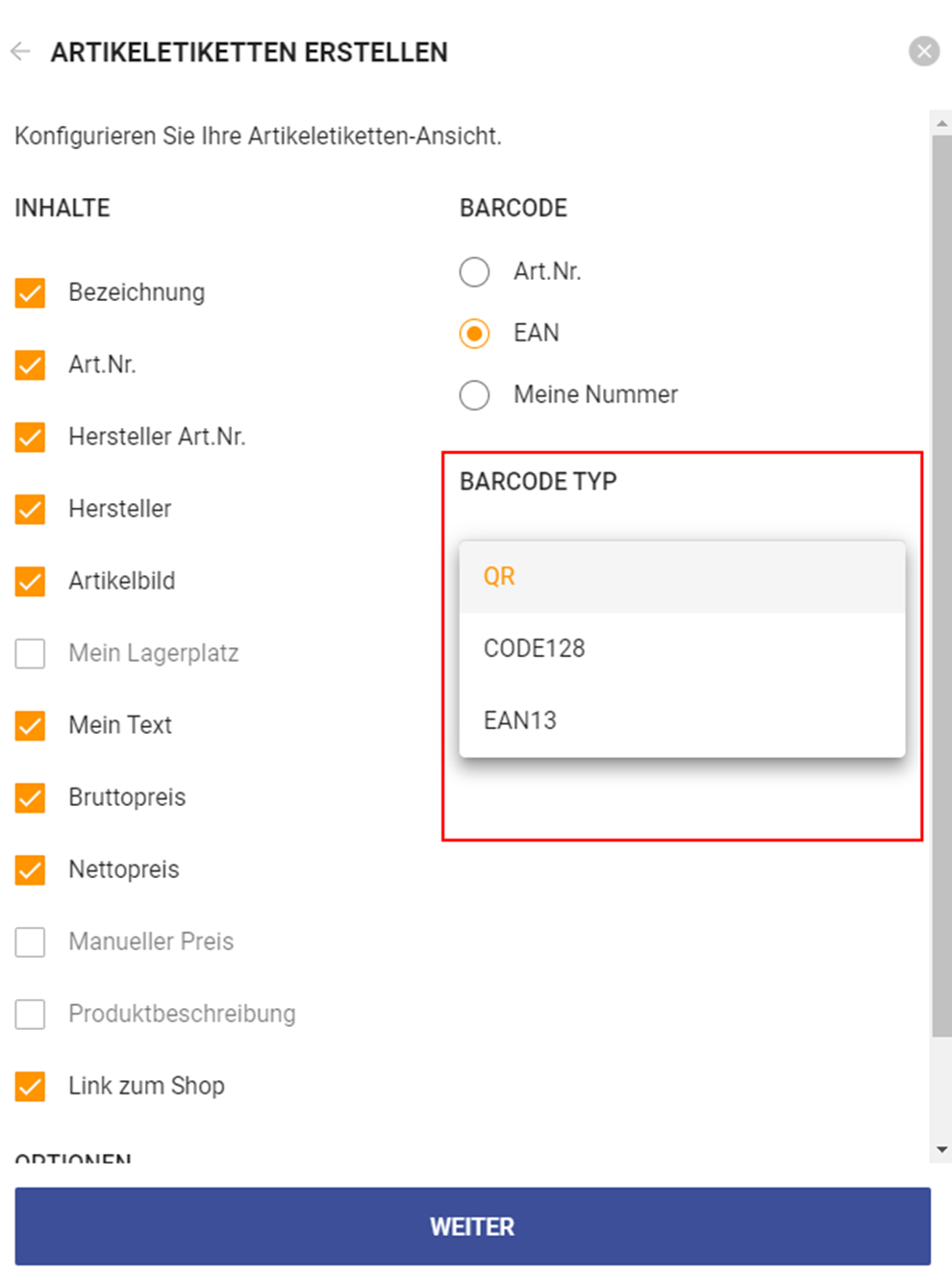 Konfigurieren Sie anschließend Ihre individuellen Etiketten nach den folgenden Inhalten und wählen Sie Ihren gewünschten Barcode Typ.