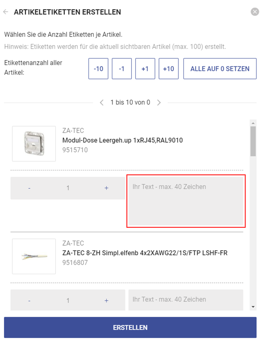 Einige der Artikeletiketten können Sie ebenfalls mit manuellen Texten versehen. Bitte achten Sie hierbei auf die Maximalanzahl der Artikelzeichen.