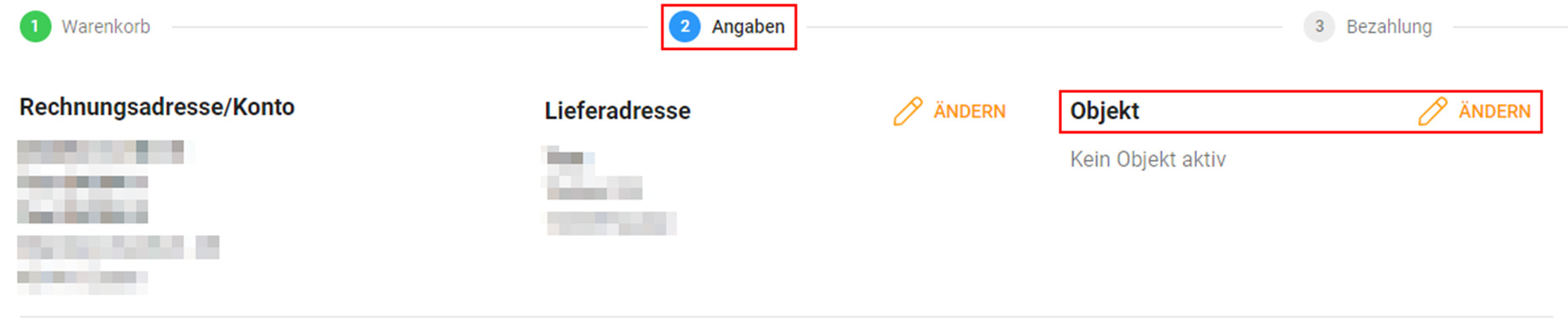 Im Adressenbereich befindet sich die Möglichkeit, für diesen Warenkorb das gewünschte Objekt durch Anklicken von Ändern neben der Überschrift Objekt auszuwählen.