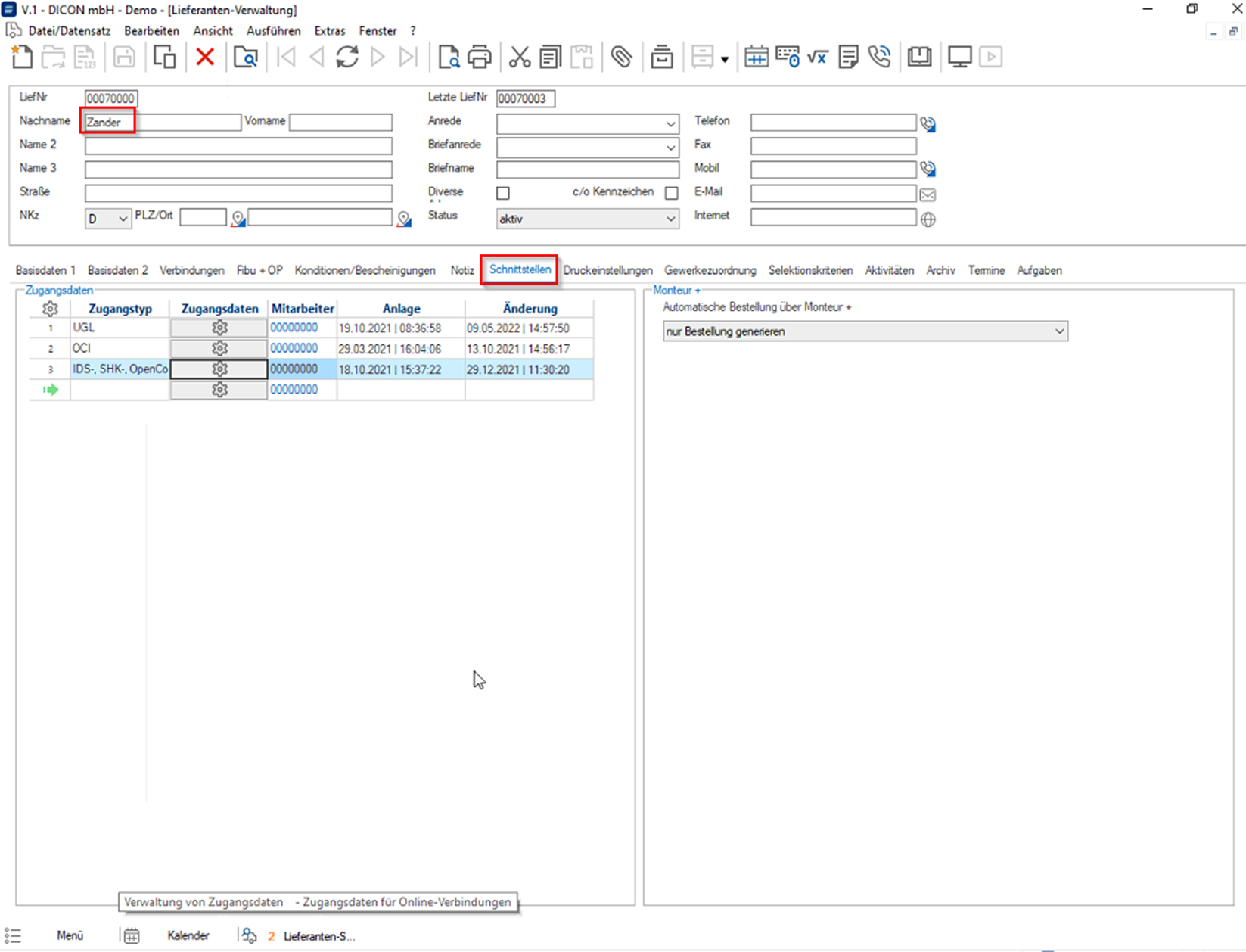 Lieferantensuche à ZANDER auswählen à Lieferantenverwaltung à Zugangsdaten