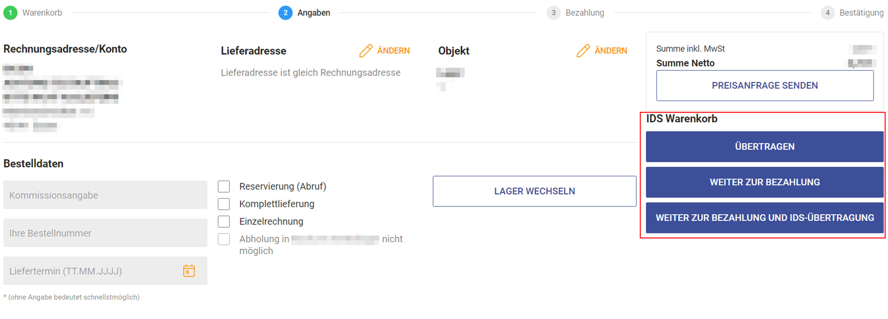 Wenn Sie IDS-Connect in Ihrer Handwerkersoftware eingerichtet haben müssen Sie ein neues Dokument erstellen. Hier könnten Sie den Datenimport aus IDS-Connect (Onlineshop-Artikelimport) wählen, damit Sie aus Ihrer Software aus im Onlineshop angemeldet werden. Legen Sie hier alle Artikel in den Warenkorb die Sie benötigen und klicken Sie im Warenkorb auf "Weiter" um zu den Bestellangaben zu gelangen. In den Bestellangaben haben Sie nun drei Möglichkeiten aus denen Sie wählen können, was mit Ihrem IDS-Warenkorb passieren soll. Sie können die Positionen "übertragen", "bestellen" oder "bestellen und übertragen.
