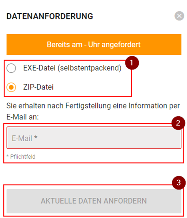 Danach müssen Sie nur noch Ihre E-Mail Adresse hinterlegen, damit Sie eine Benachrichtigung bekommen, sobald die Daten fertig aufbereitet wurden und auf "aktuelle Daten anfordern" klicken.