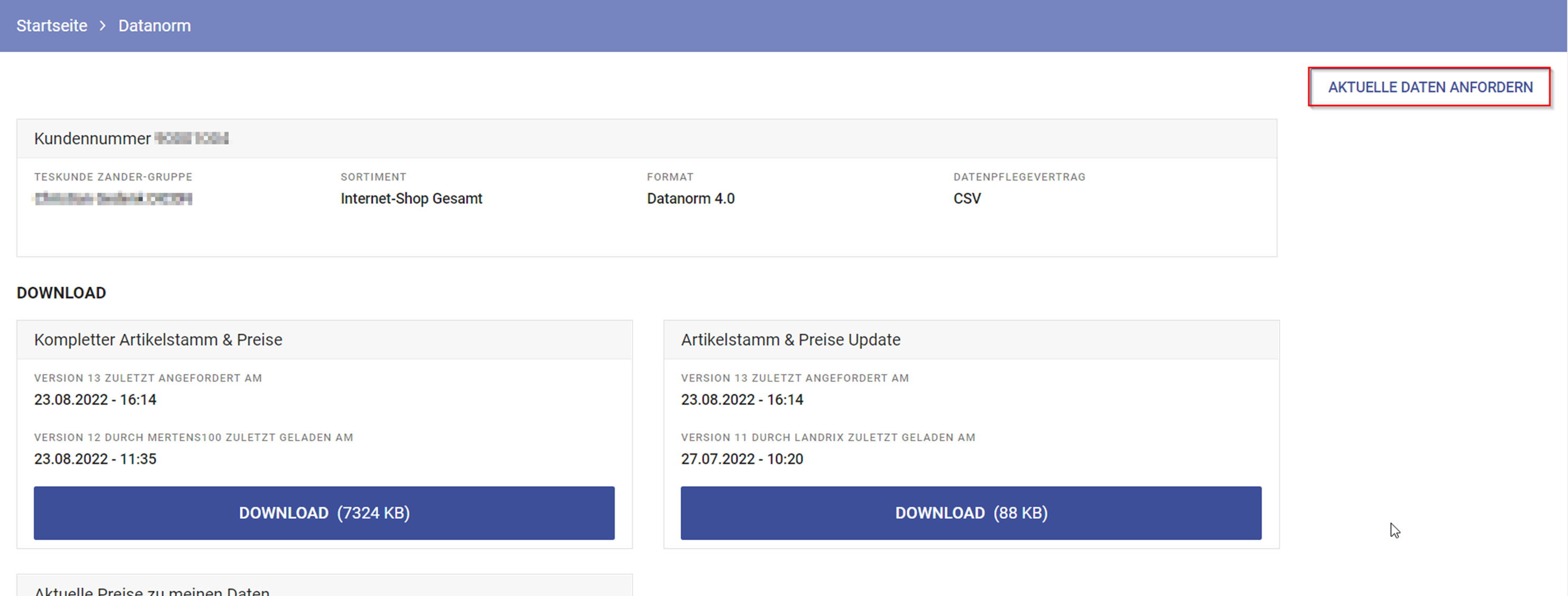 Klicken Sie nun unter Datenaustausch auf "Datanorm". Wenn Ihnen dieser Menüpunkt nicht angzeigt wird, dann wenden Sie sich bitte an Ihren Onlineberater, damit dieser für Sie Datanorm freischalten kann. Oben rechts wird Ihnen nun der Button "Aktuelle Daten anfordern" angezeigt.