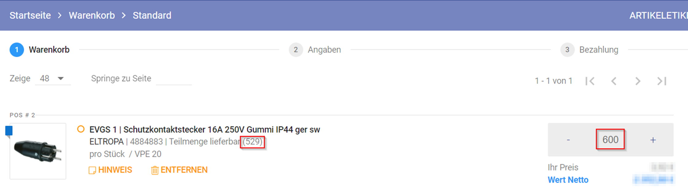 Sollten Sie von einem Artikel mehr bestellen wollen, wie am Lager vorhanden ist, bekommen Sie im Warenkorb einen Hinweis, dass der Artikel "teilweise lieferbar" ist. Bedeutet die verfügbare Menge wird geliefert und die restliche Menge geht in den Rückstand und wird nachgeliefert.