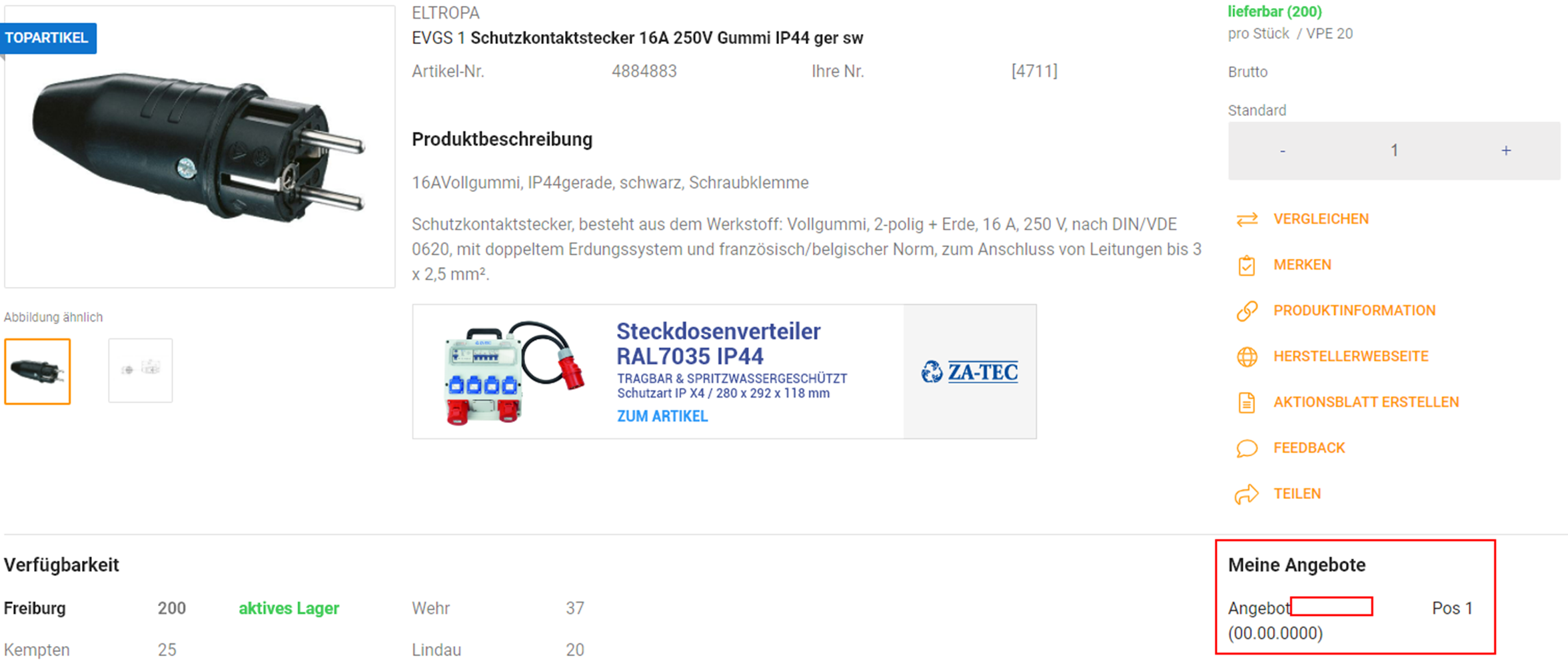 Unterhalb der Beschriftung „Ihre Angebote“ werden die Angebotsnummern angezeigt, in denen der Artikel enhalten ist.