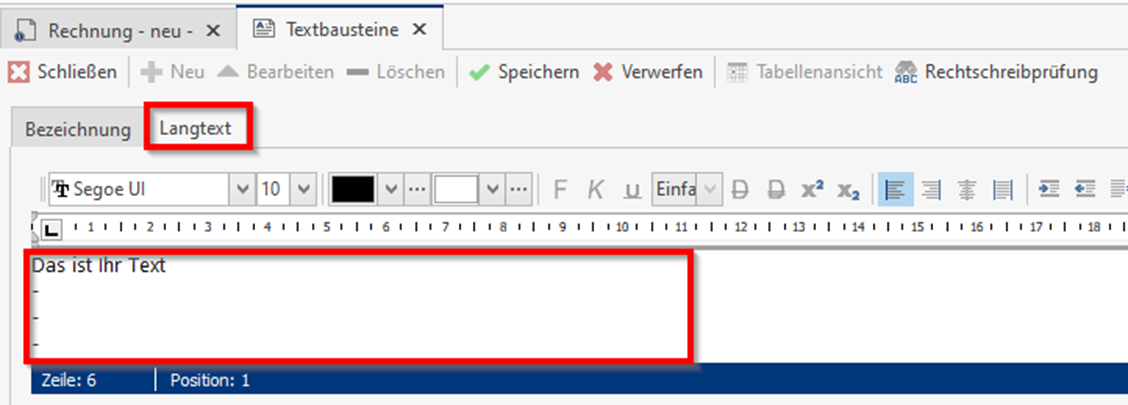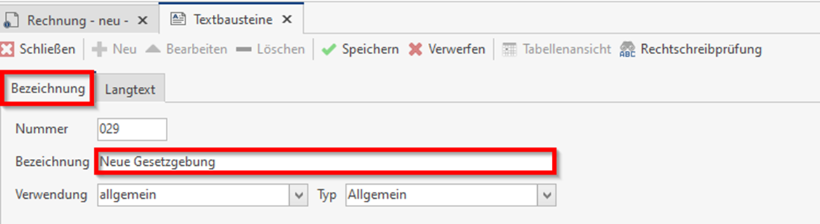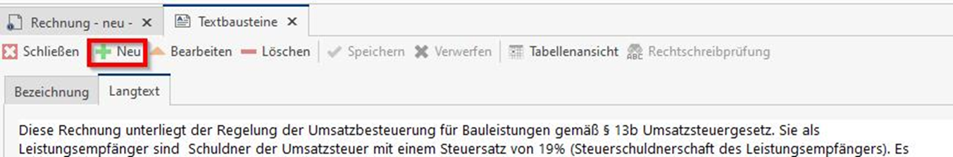 Vergeben Sie nun unter dem Reiter „Bezeichnung“ die Bezeichnung des Textbausteins und unter „Langtext“ den Text den Sie in der Rechnung einbauen möchten. Gerne können Sie für den passenden Text Ihren Steuerberater nach einem Entwurf fragen.