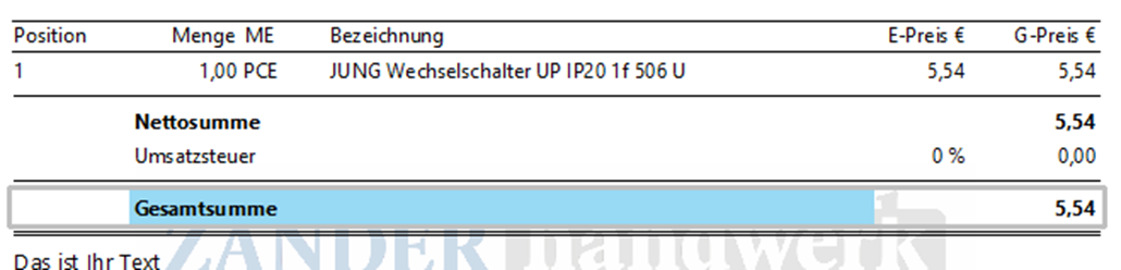 Nun wurde der Textbaustein unter der Gesamtsumme hinzugefügt: