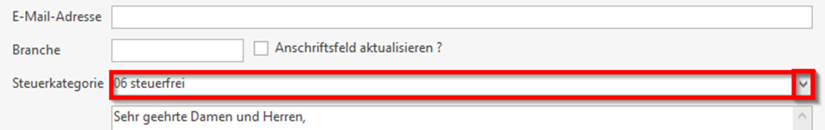 In dieser Maske finden Sie unten die Steuerkategorie. Klicken Sie hier auf den Pfeil, um „06 steuerfrei“ zu wählen: